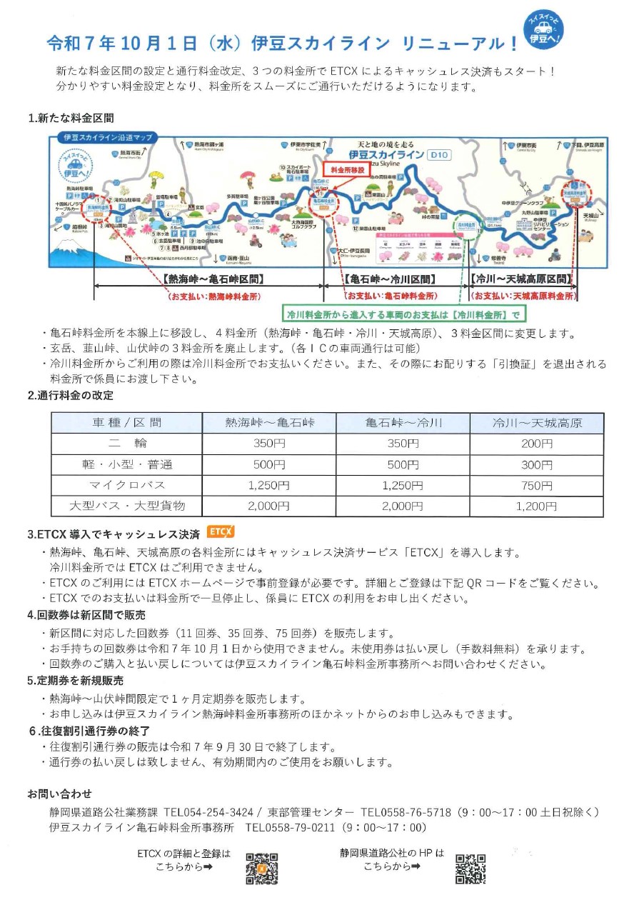 伊豆スカイライン料金区間、通行料金改定について