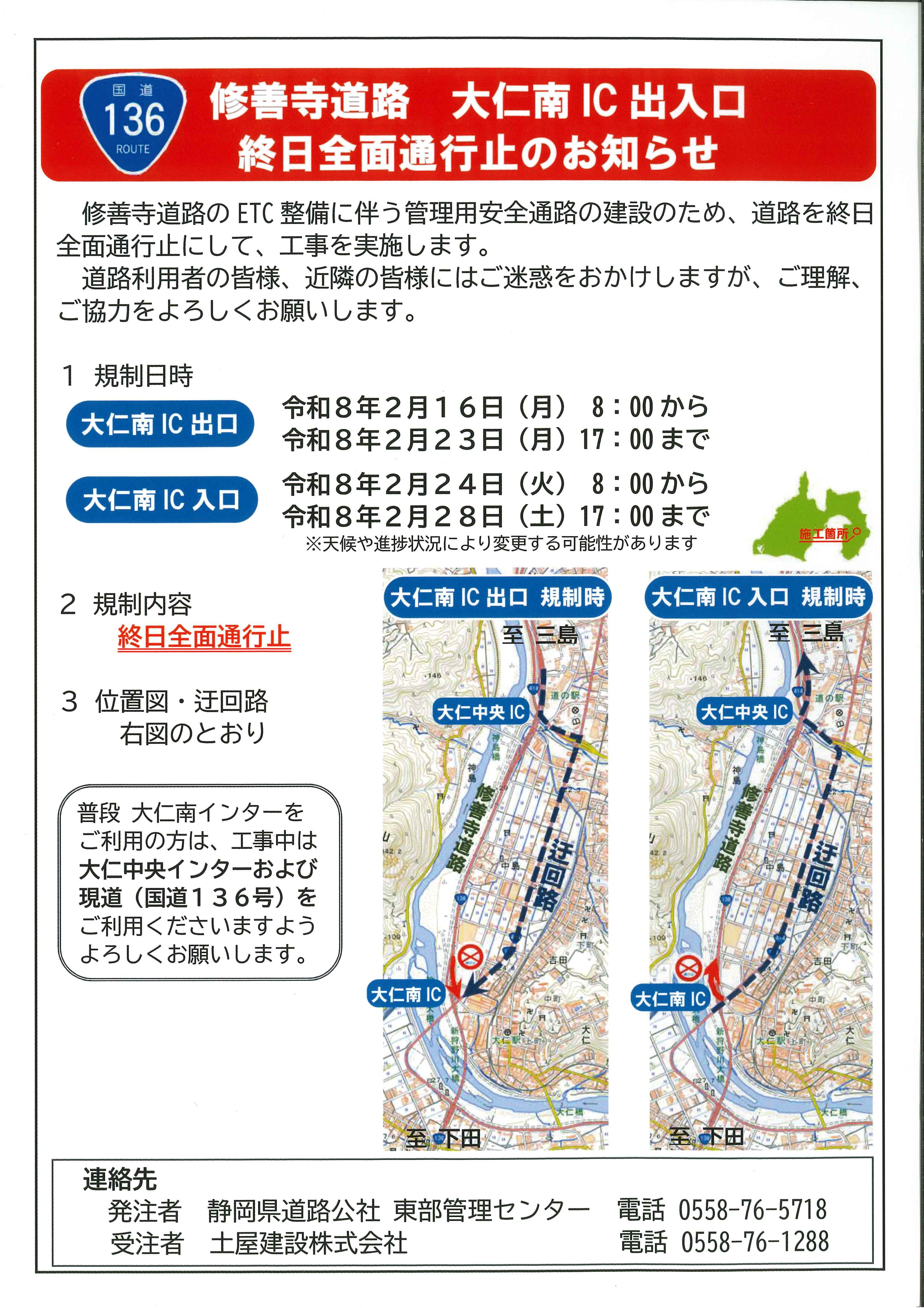 新着情報 news 2026/02/13 お知らせ 修善寺道路「大仁南IC」出入口通行止めのお知らせ 沼津・三島方面よりご来場予定の皆様へ 修善寺道路 大仁南IC出入口が終日全面通行止めとなりますので、 お知らせいたします。 工事期間中は「大仁中央IC」および「国道136号線」をご利用くださいませ。 PDFファイルはこちら↓ 修善寺道路通行止め 前へ 一覧へ戻る